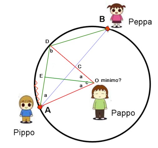 dunque, nessuna tangente esterna (c'è un muro!). Seguire la corda a pezzettini (non ho ben capito li significato delle varie lettere... riscrivi per bene) non si avvicina certo al minimo percorso, nessun angolo misurabile se non 90° e, poi, riscrivi tutto stando attento alle lettere e spiegando meglio... Ma poi raggiunge Peppa? Raggiungere Peppa è un obbligo fondamentale... e decisivo.