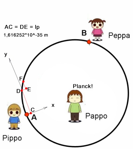 sarebbe perfetto, ma... come fa Pappo a dirigersi verso Peppa con esattezza (l'esattezza è richiesta , altrimenti non valgono le varie relazioni...)? Io avevo detto nel testo: "... un metro rigido molto lungo (ma decisamente minore del raggio)...". L'hai detto tu stesso : "avendo un regolo abbastanza lungo...", ma non lo è...