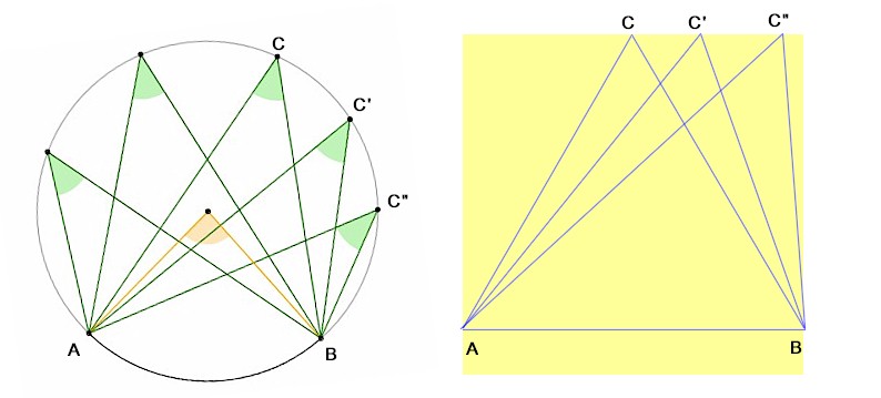 E' la curvatura della circonferenza, nella figura a sinistra, che "accomoda" le cose e mantiene costante l'angolo in C, C', C".