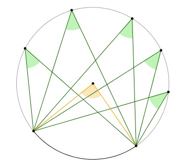 Dal centro O , la corda CB è vista sotto un angolo doppio di quello con cui è vista dal punto A, sula circonferenza.