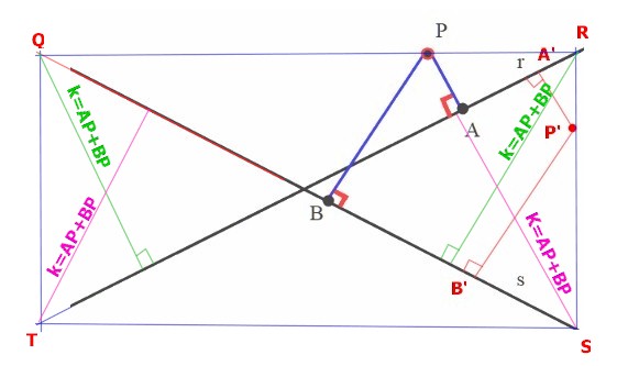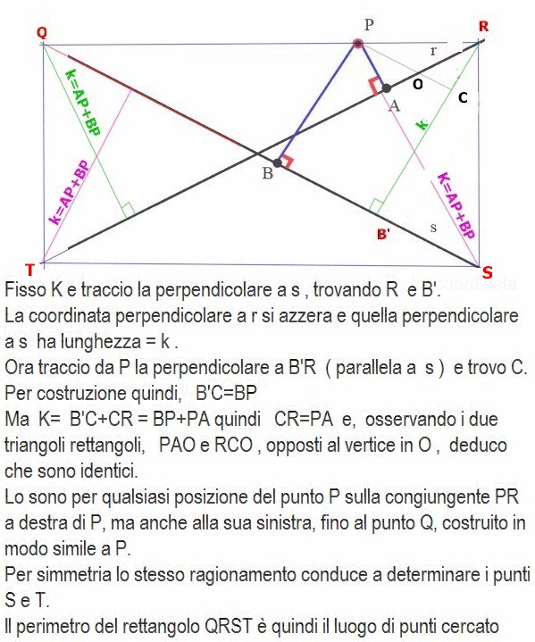 traccio le linee verdi di lunghezza K=AP+BP perpendicolari alle rette r ed s in modo che quella perpendicolare a r individui su s il punto Q. Quella perpendicolare a s individua su r il punto R.