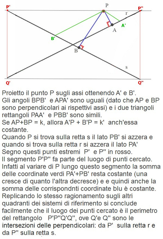 ribadisco che Non c'è scritto da nessuna parte che A e B siano fissi. Le rette r, s sono fisse. Le proiezioni di P variano. Si chiede quando la somma delle distanze PA e PB dalle rette sia costante.