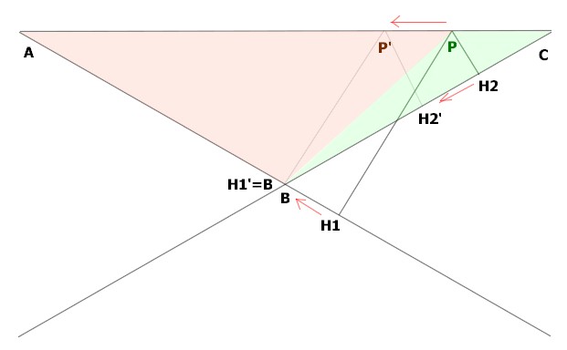 ABC è il triangolo isoscele (AB=BC) e l'angolo ABC è > 90°. P è posizionato in modo che H1 cada fuori dall'area di ABC
