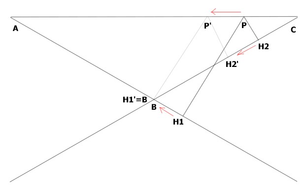 Ora sposto (frecce rosse) P in P1, in modo che H1 vada in H1'(=B) e conseguentemente H2 vada in H2'.
