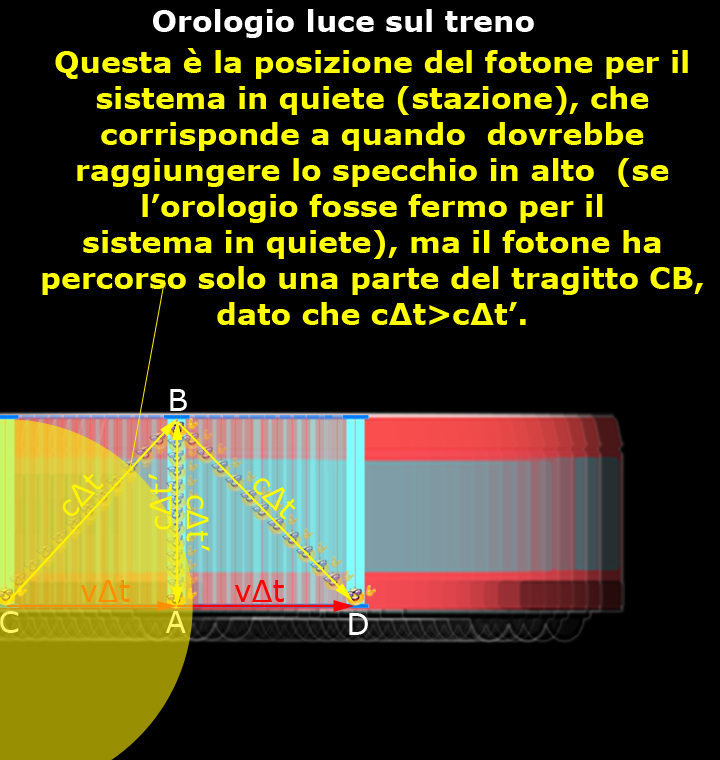 Per chi si trova in stazione, nel medesimo intervallo di tempo (Δt) l’orologio luce si muove da C ad A e da A a D, alla velocità v, ossia alla velocità del treno misurata da chi si trova in stazione.