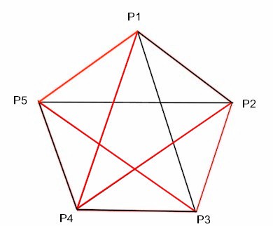 Proseguendo nei collegamenti , mi occupo di P3. Per non generare un triangolo monocromo nero P6 P1 P3 , dovrò collegare P3 a P6 con un lato rosso, così: