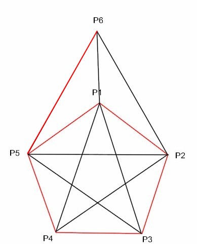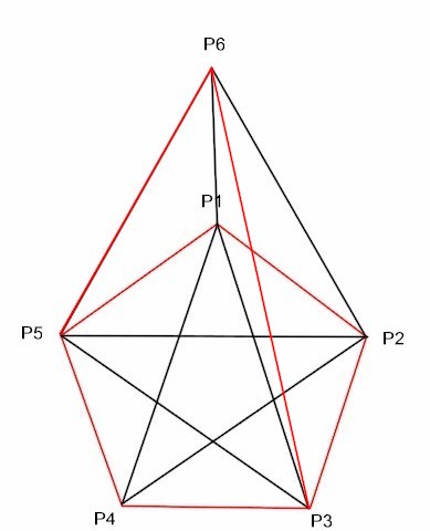 Partendo da una configurazione K5 priva di triangoli monocromi, ( ad esempio quella di sinistra, nella figura soprastante) introduciamo i collegamenti con un punto P6.