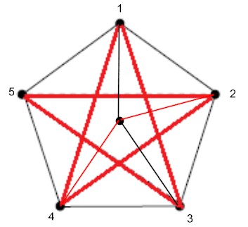 Ora però se collego l'ultimo punto, il 5 con un lato rosso si forma il triangolo monocromatico rosso tra i punti 5 2 e il centro. Ma se uso un lato nero si forma un triangolo monocromatico nero tra i punti 5 1 e il centro.