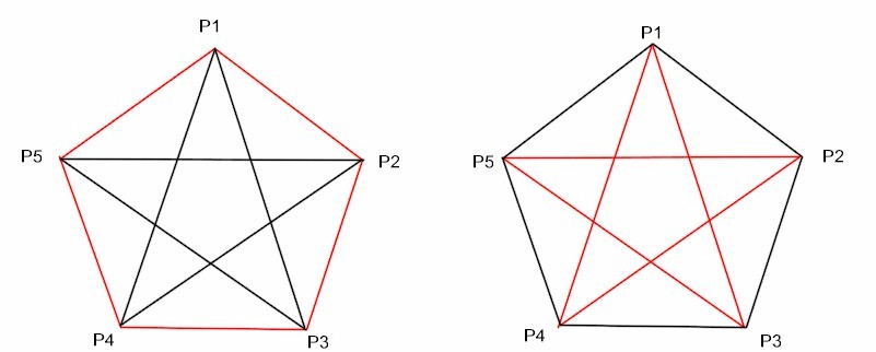 Possiamo convincerci di questo osservando questi grafi K5 , che rispettano questa regola: se in uno di essi commutiamo il colore di un qualsiasi lato: si viene a formare subito un triangolo monocromo.