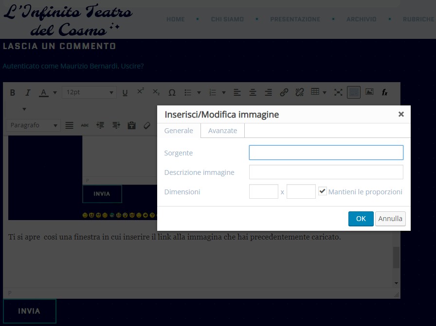 Incolla il link ed eventualmente scegli le dimensioni, oppure lascia tutto come è perché potrai ridimensionare la figura anche dopo averla inserite nel commento.